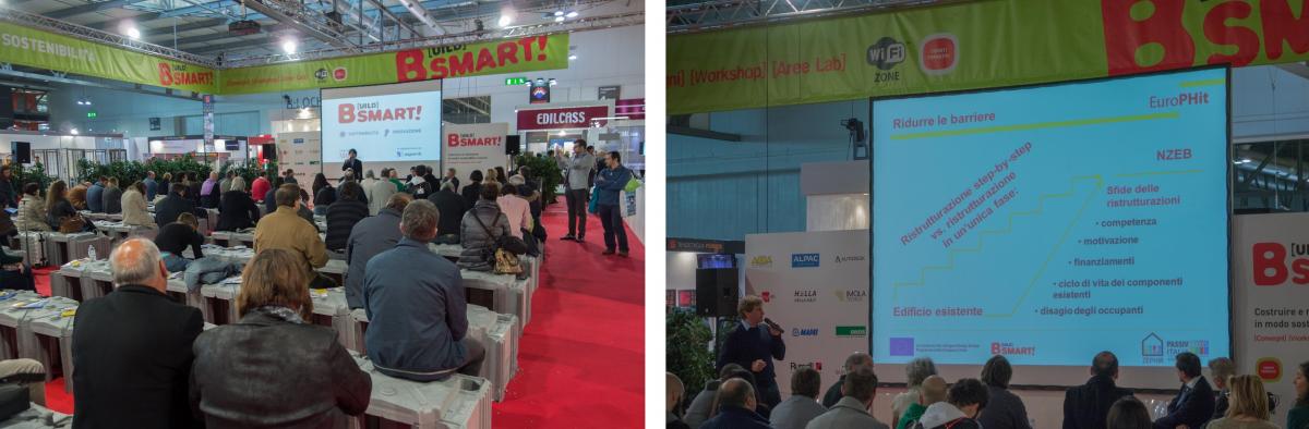 2015 Milan, IT. The fifth EuroPHit Financial Workshop was held within Made Expo (left); Fabio Ferrario from ZEPHIR is presenting at the Workshop (right), Photos © ZEPHIR