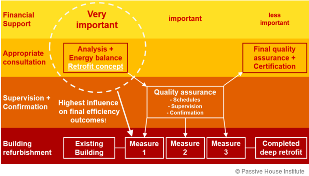 Step-by-step energy efficiency retrofits require thorough planning and experienced consultation. As a result the initial investment for technical support may be higher for suitable efficiency approaches than standard, moderate efficiency measures. In many cases of single retrofit measures, consultation will not be available, as single measures, for example the replacement of windows, do not require building authority approvals. As a result, the building owner and tradespeople often carry out the work without architects and other experts. This lack of consultation, however, will lead to lock-in effects or compromise other efficiency measures to be performed later.
