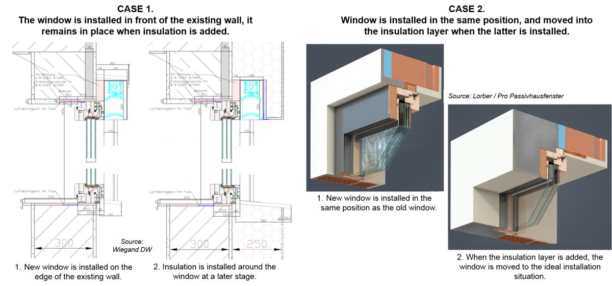 Two main problems should be considered when installing new windows in an existing wall. First, the improved airtightness performance of the new window may lead to the formation of mold in the old wall if additional ventilation is not considered. This need for additional ventilation should be highlighted with the end-user in order to prevent mold. Second, the best installation situation for the window is when it is aligned to the insulation layer, which, in this case, would be added on a later stage. Ideally, the installation of the window should be planned in such a way that, when the insulation layer is added, the window ends up in the best installation position. Several solutions are suggested for this case, for example: