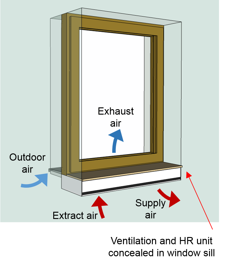 If windows are being replaced in an old building, a ventilation system can also be integrated, for instance, in the window frame itself, on the space used for the old shutter box, in the parapet, or a separate box. Special considerations for this component would be thermal bridges, accessibility for filter exchange, noise control, and also, the traditional overflow concept does not work with this type of ventilation units. However, being a decentralized unit, there is no need for ducts and the structure of the building is not altered. Several products exist in the market, but so far, they do not include a heat recovery system with the efficiency required for the Passive House standard.
